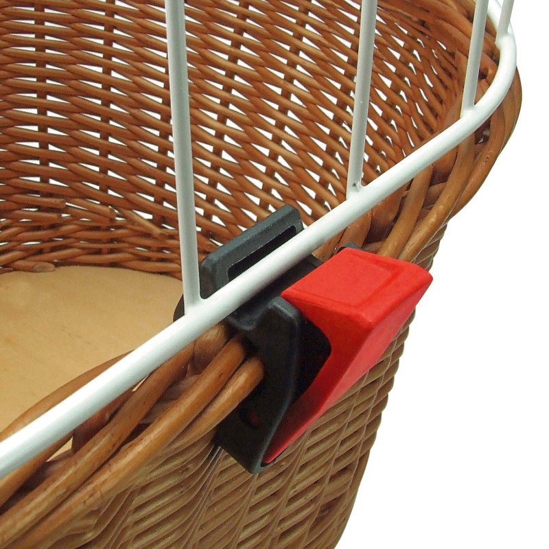 The basket prioritizes secure and simple use, featuring two special hinges and a Klickfix fastener that eliminate the need for complicated straps. For flexibility, the protective grille can be removed entirely. It includes a reflector for safety, a carrying handle for easy portability, and a washable floor cushion for pet comfort.